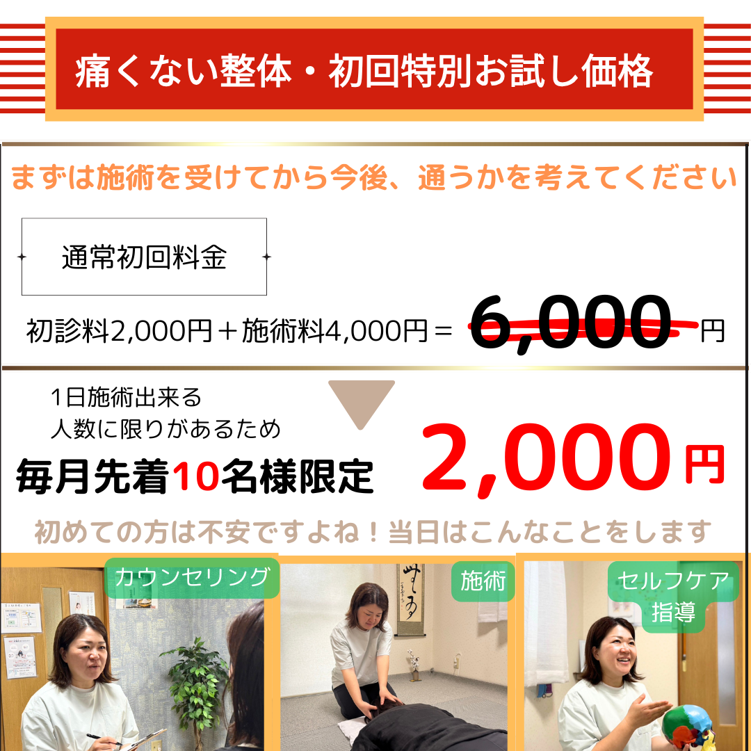 そこで、当院の施術を気軽にお試し頂けるように、初回割引で2000円で施術させて頂きます。